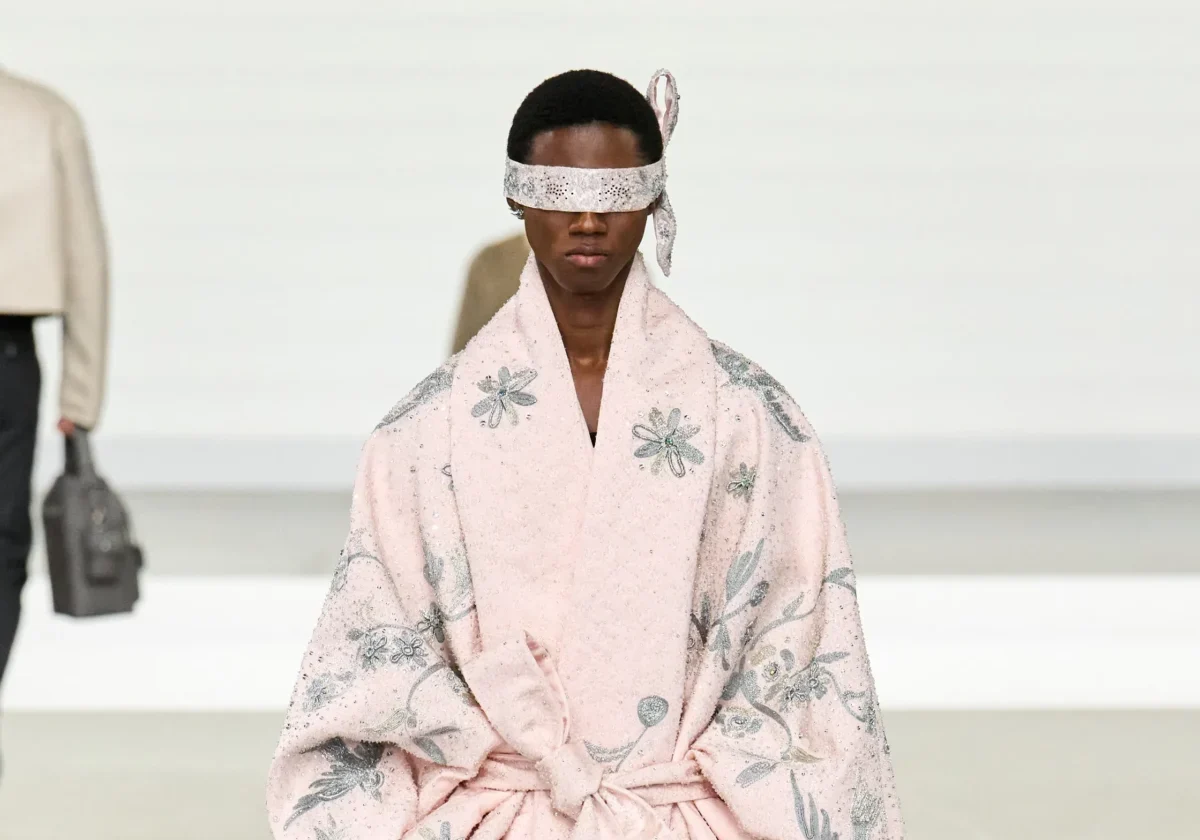 At Dior, Kim Jones ended his tenure on a romantic note — literally. His final collection was flooded with barely-there pinks, from sleek overcoats to minimalist suiting and knitwear adorned with subtle straps and detailing. Some looks paired pink with wide-legged pinstriped trousers, others wrapped it into Japanese-inspired floral robes embroidered with diamonds and paired with his now-iconic eye masks.