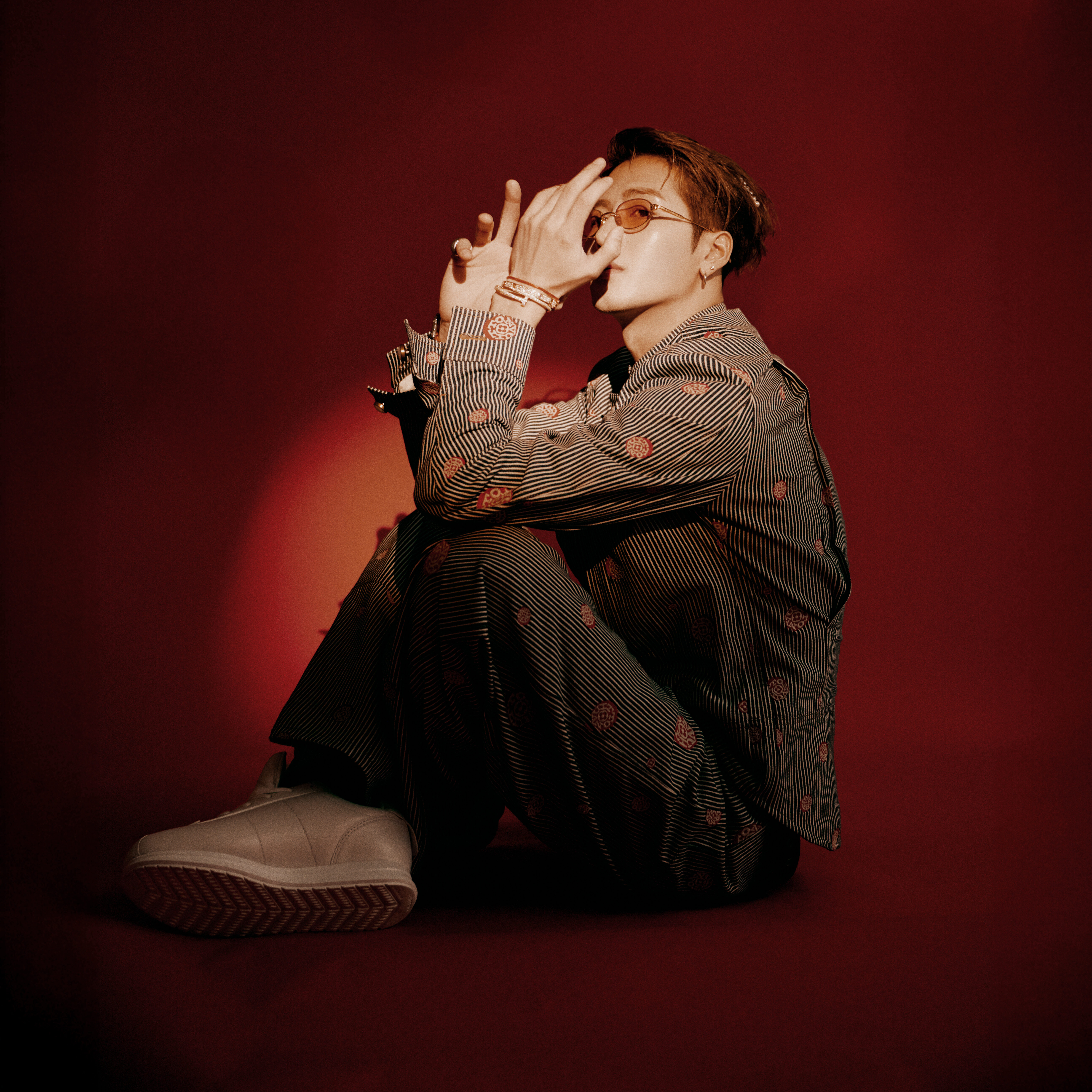 Jackson Wang 這天身穿 Louis Vuitton 2025 秋冬男裝系列單品盛裝出席,一整套以條紋設計的無領牛仔外套與工裝褲完滿展現俐落線條,同時也反映出 Jackson Wang 的硬朗型格形象。此外,這套服裝還巧妙地在不同位置繡上大小不一的粉紅色字樣波點圖案,呼應着臉上的粉紅鏡片太陽眼鏡,搭載全白 LV ButterSoft 運動鞋,營造出吻合 Pharrell Williams 美學的時裝魅力。