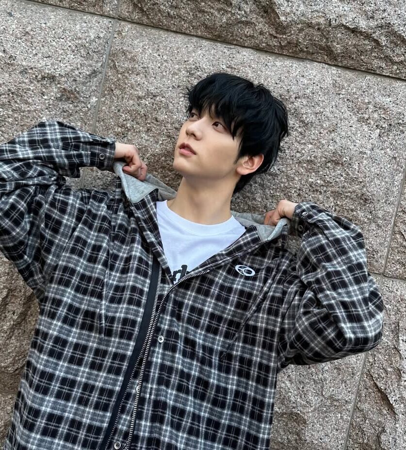 喜歡更活潑一點的話,ATEEZ 的 MINGI 也換上有棋盤暗格紋的針織上衣,全黑設計配上粗框眼鏡型格同時又更顯少年氣息。