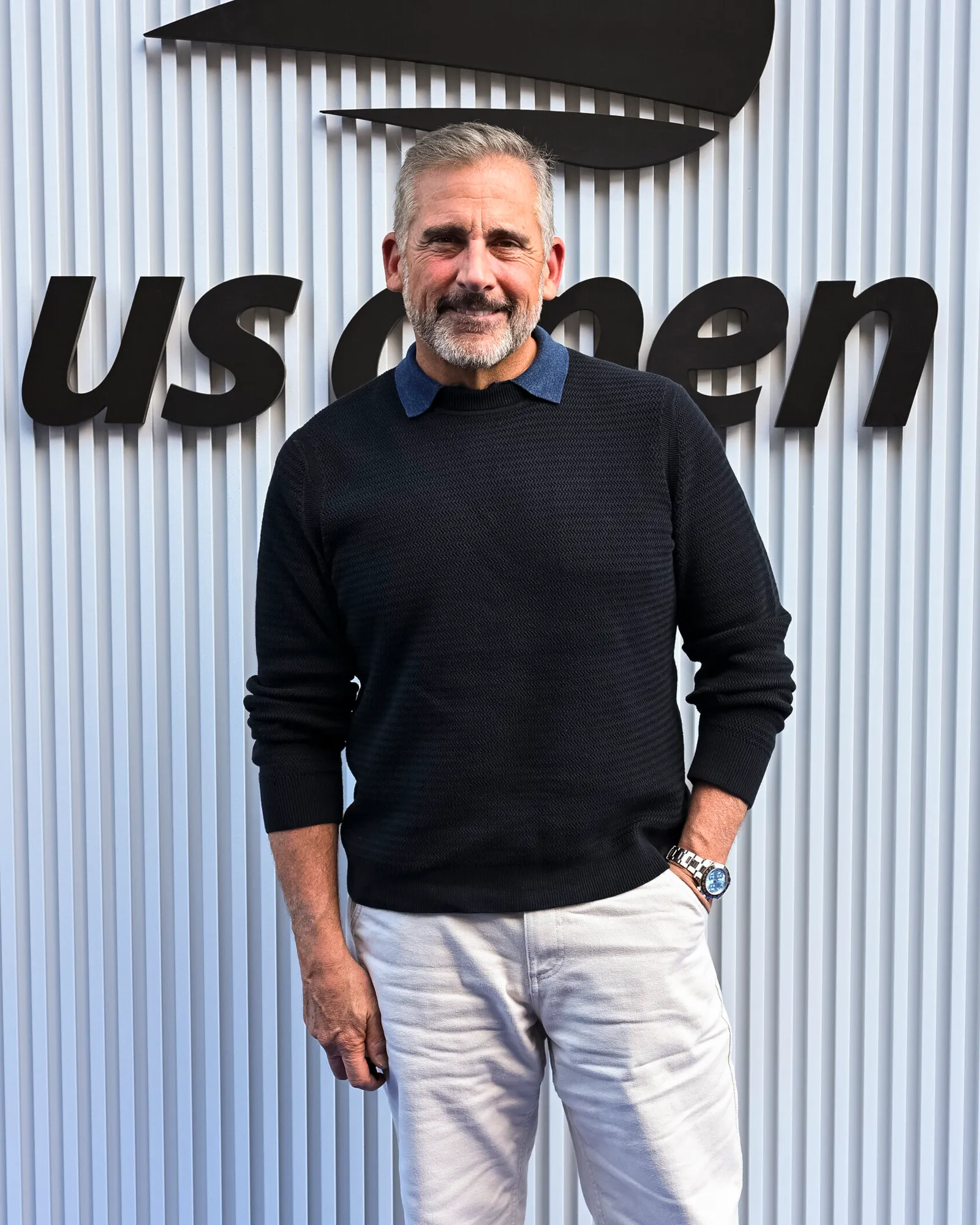 Steve Carell 深知鉑金 Daytona 的魅力所在。他所佩戴的這款型號為 116506 的 Daytona 腕表,是對世界頂級賽車計時碼表之一的優雅演繹,擁有 40 毫米鉑金表殼、與之相配的鉑金蠔式錶帶、棕色 Cerachrom 表圈(帶測速刻度)、冰藍色錶盤和鑲鑽時標。Rolex 只將這種獨特的藍色與鉑金款搭配,打造出酷炫的 IYKYK(如果你懂你就懂)風格。這款 Daytona 腕表(及其非鑲鑽兄弟款)於 2013 年推出,旨在慶祝 Daytona 誕生 50 週年——儘管這採用了 Rolex 典型的非官方方式——它並非僅僅是一款精鋼腕表,而是推出了一款獨具匠心的特別之作。市面上也有阿拉伯文字和鑲鑽版本,但我們認為 Carell 的鑲鑽版本已經足夠出色了。